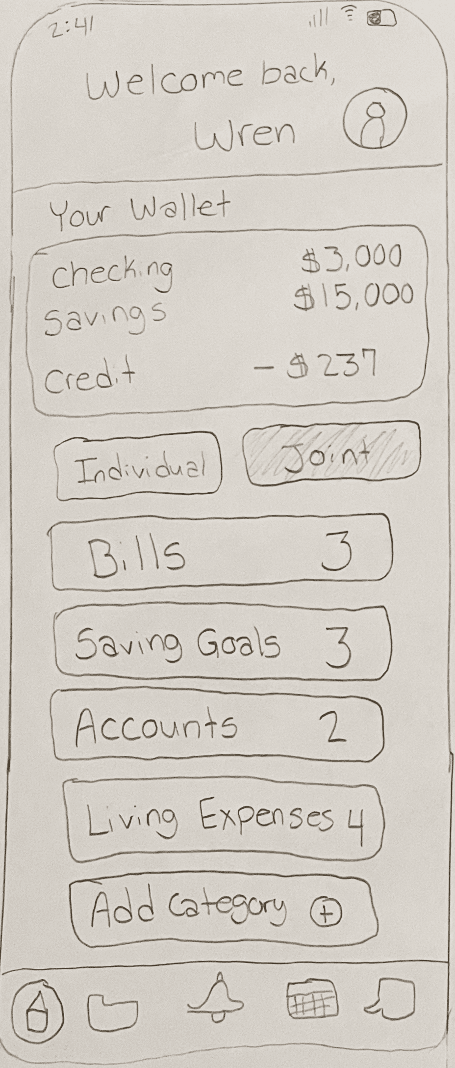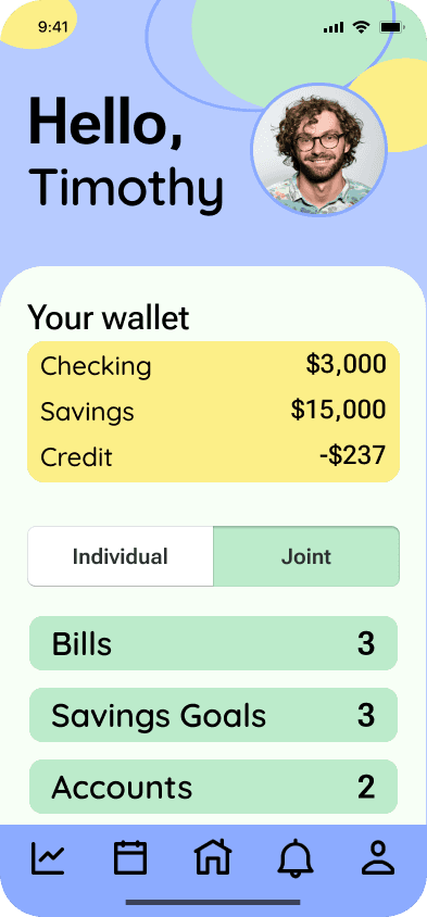 Prototype highlights the ability to toggle between individual and joint finances.